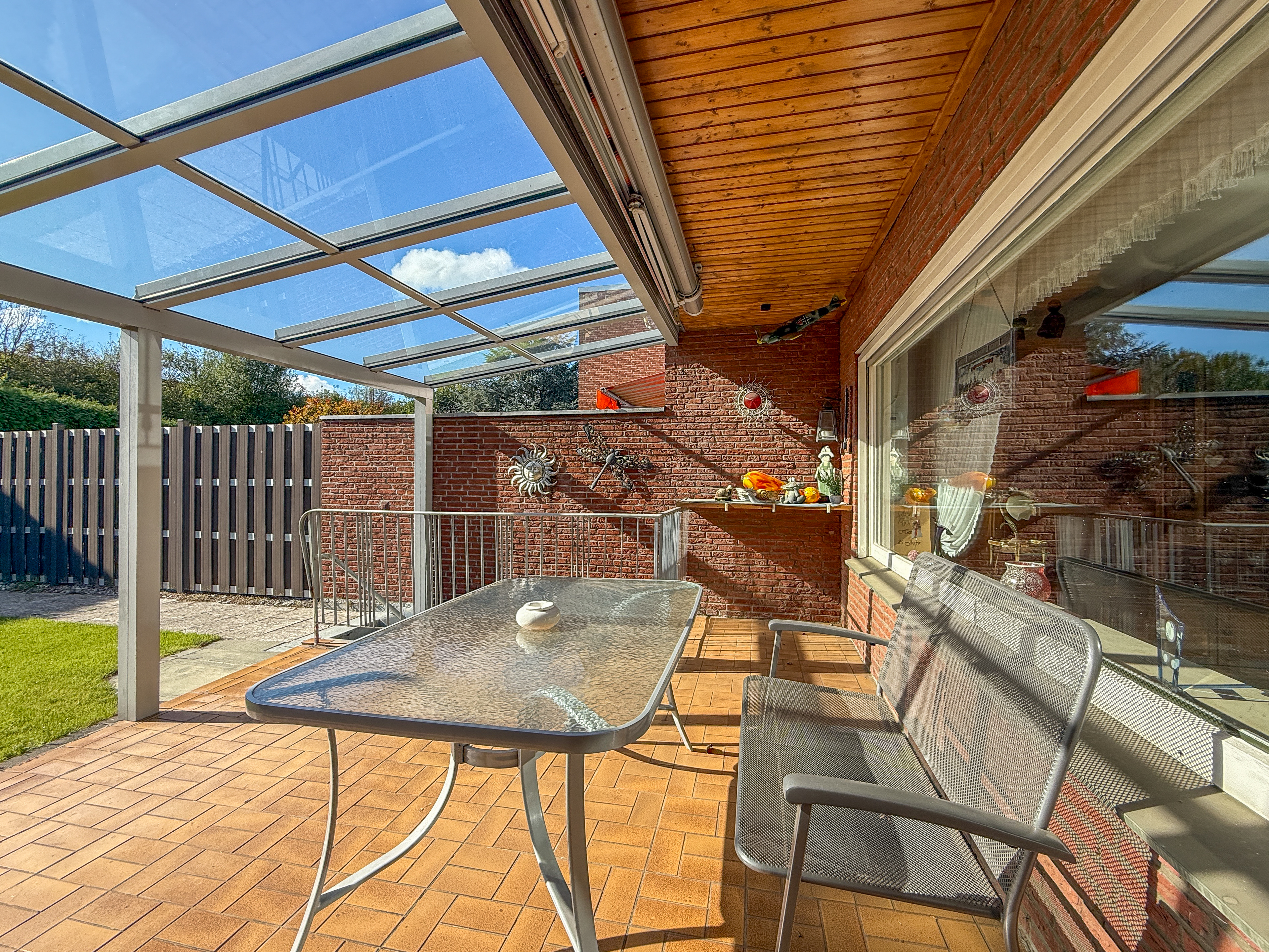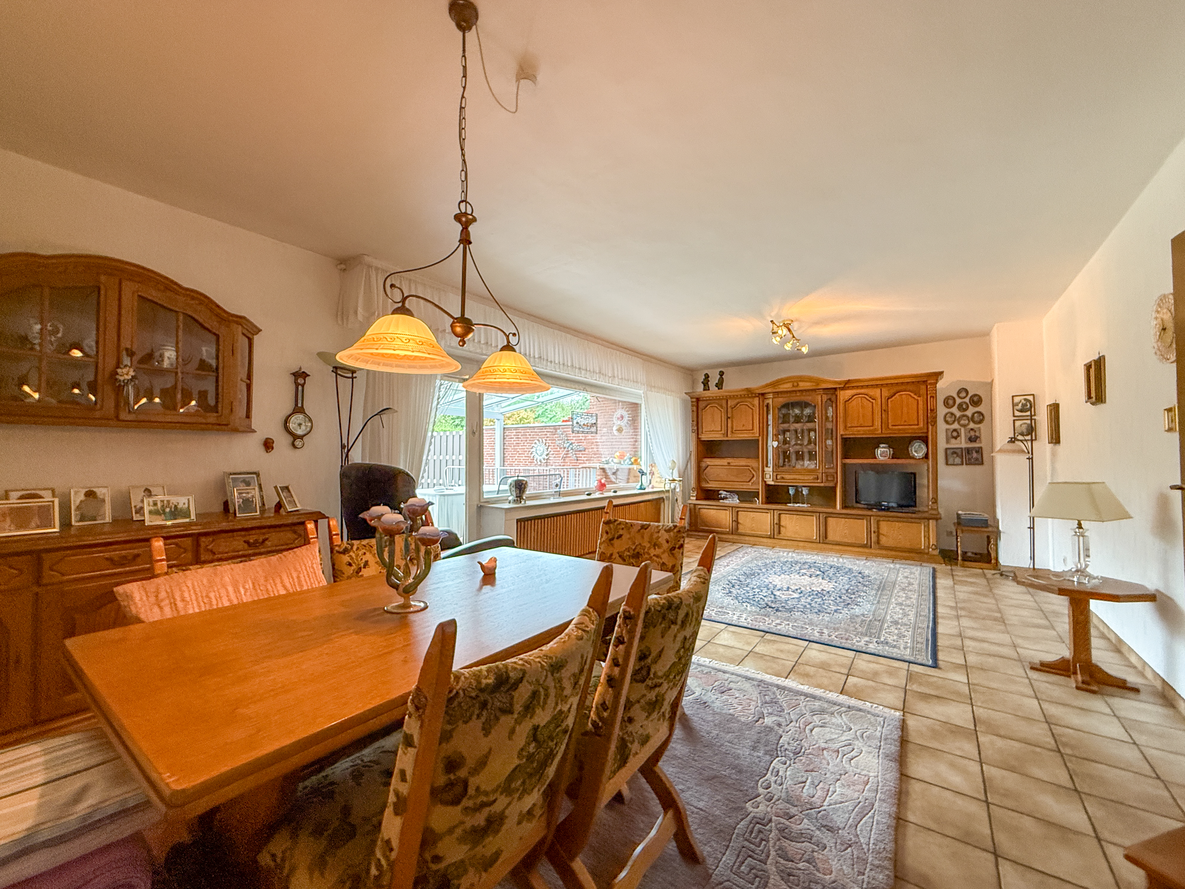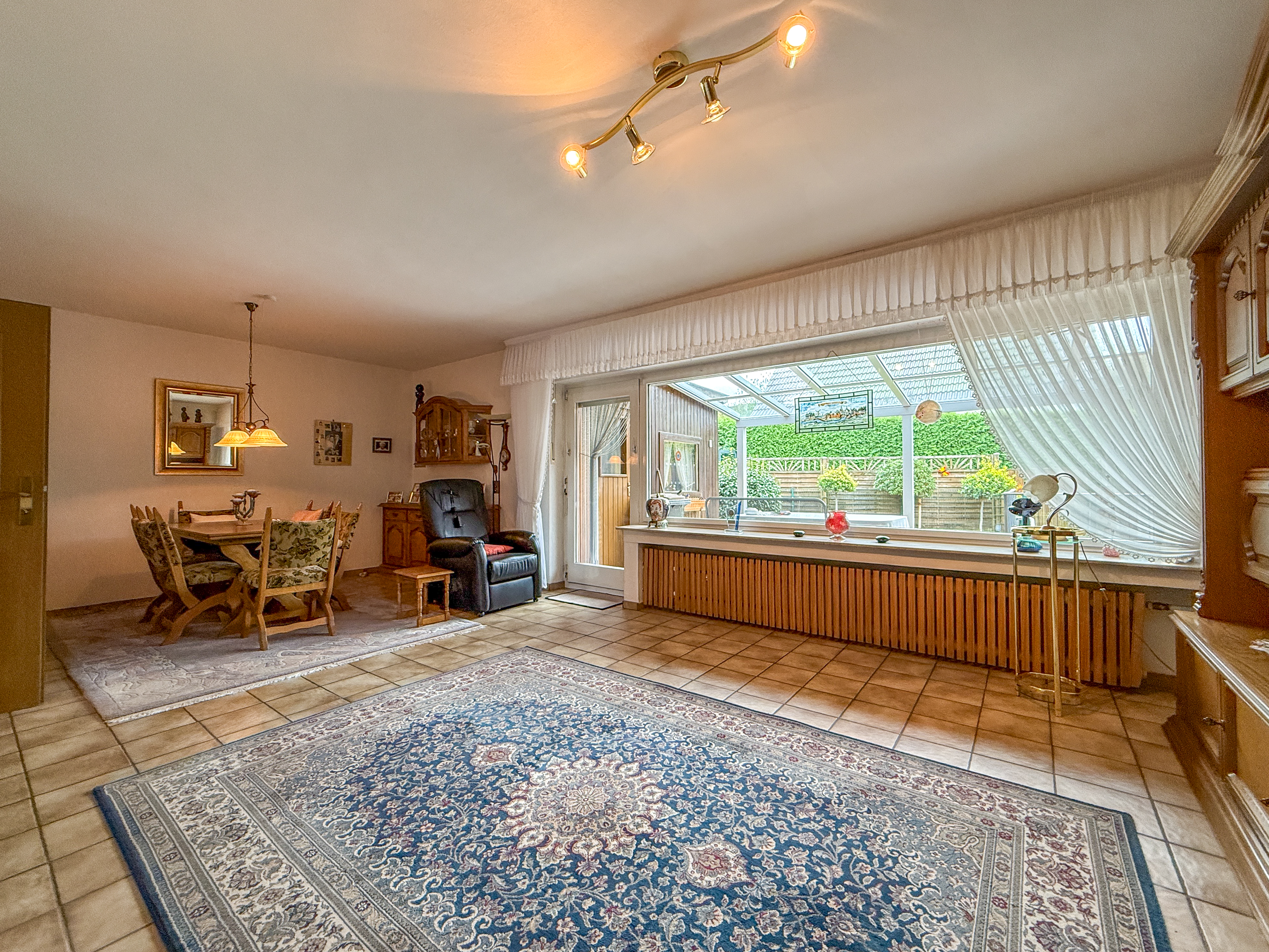 Das großzügige Wohnzimmer mit integriertem Essbereich bildet das Herzstück des Hauses. Große Fensterflächen lassen viel Tageslicht herein und schaffen eine freundliche Atmosphäre. Von hier aus gelangen Sie auf die Terrasse, die mit einer modernen Überdachung versehen ist – perfekt für entspannte Stunden im Freien, unabhängig vom Wetter. Der gepflegte Garten bietet Platz für Erholung, Freizeit und kleine Gartenprojekte. Ein rückwärtiger Zugang über einen Stichweg ermöglicht es, das Grundstück auch von hinten zu erreichen – ein praktisches Extra im Alltag.