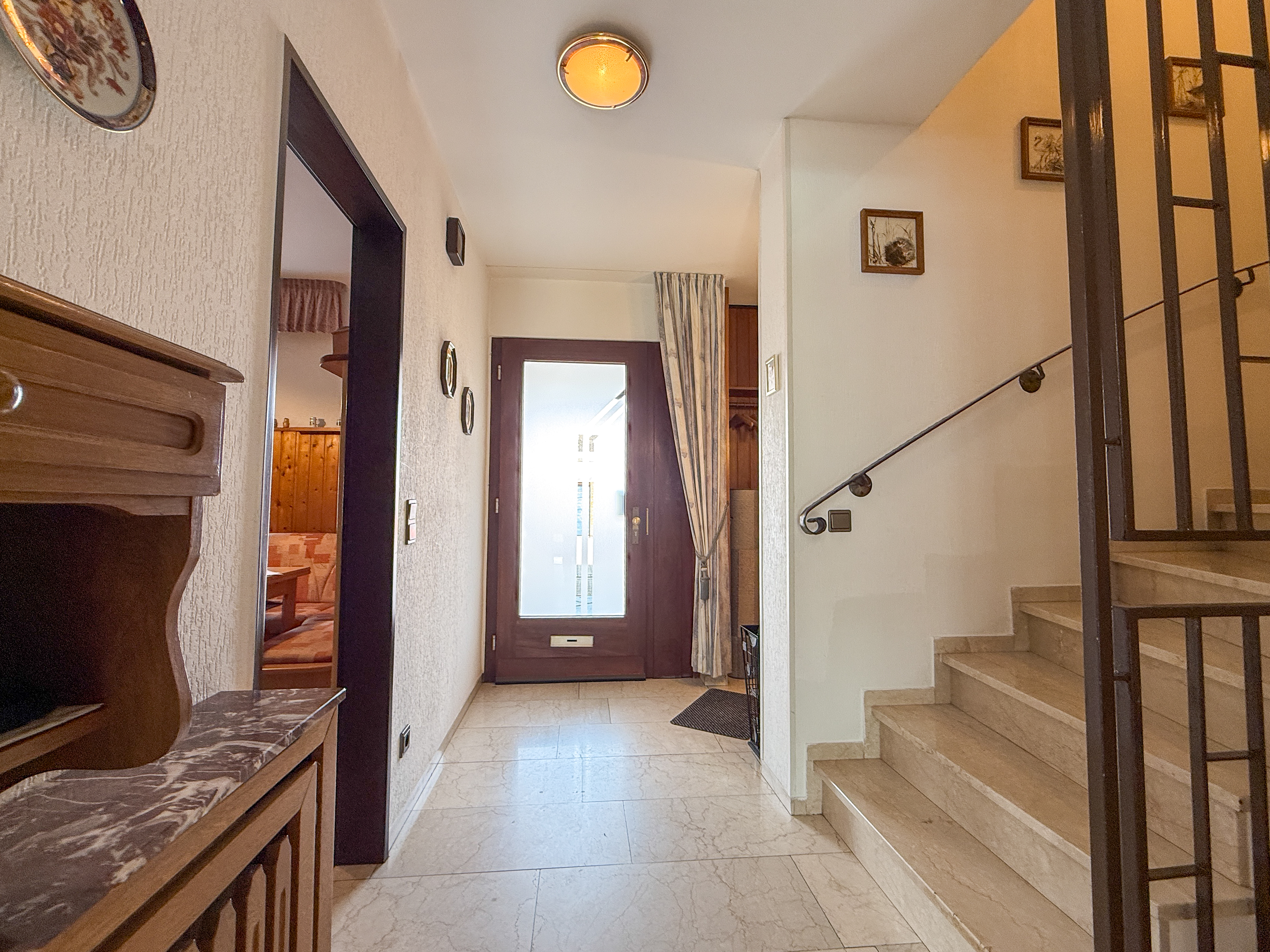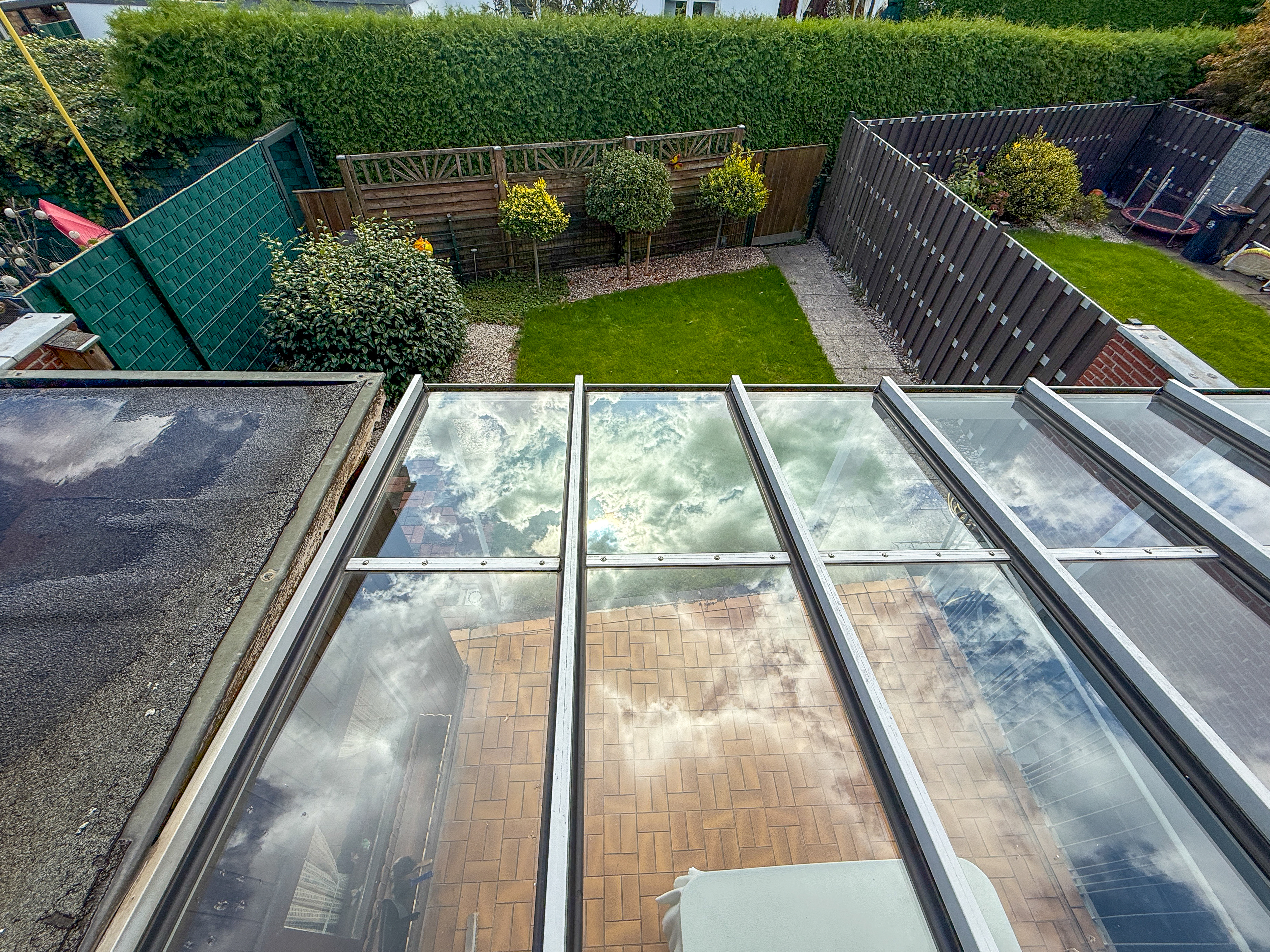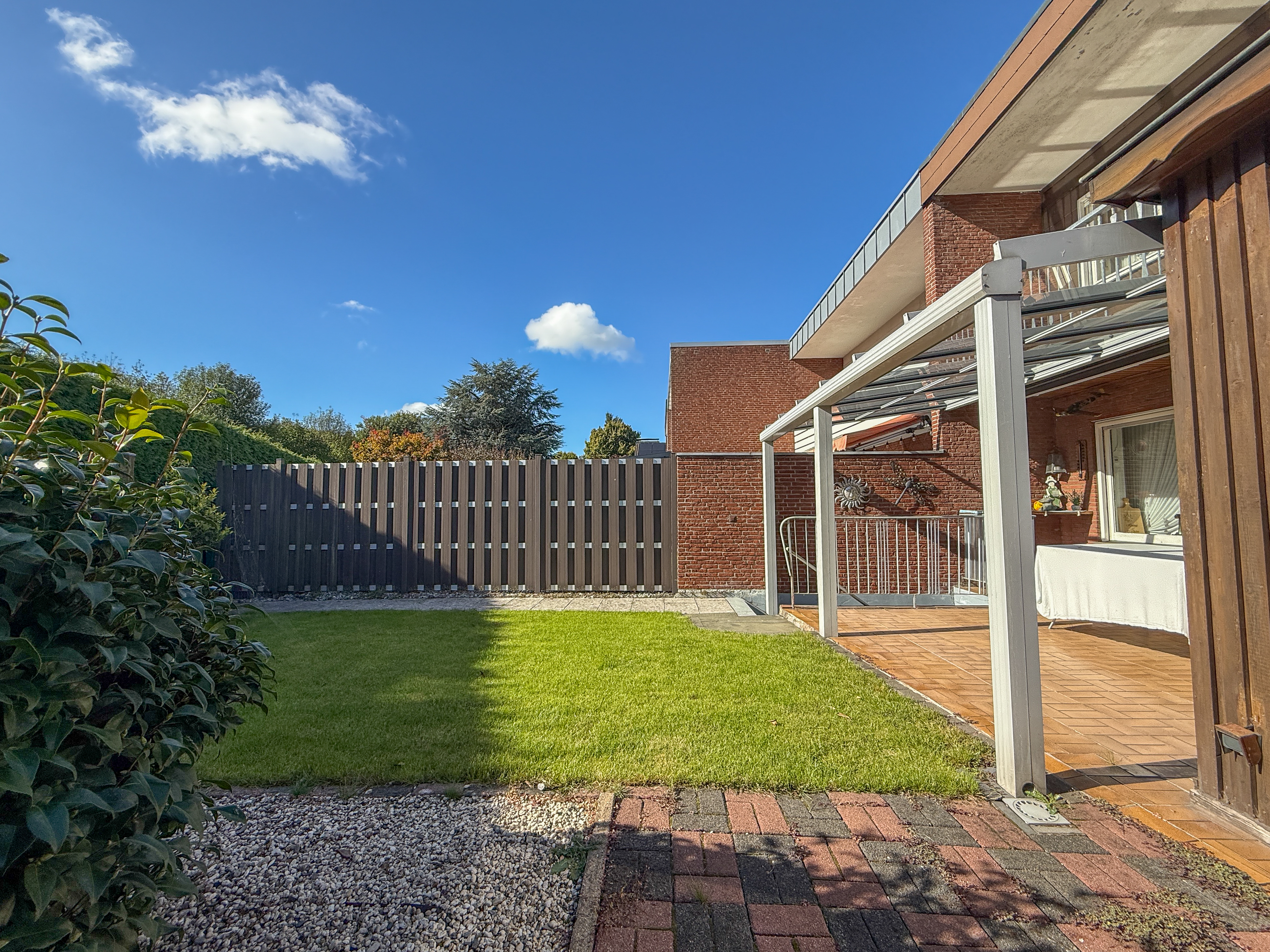 Das großzügige Wohnzimmer mit integriertem Essbereich bildet das Herzstück des Hauses. Große Fensterflächen lassen viel Tageslicht herein und schaffen eine freundliche Atmosphäre. Von hier aus gelangen Sie auf die Terrasse, die mit einer modernen Überdachung versehen ist – perfekt für entspannte Stunden im Freien, unabhängig vom Wetter. Der gepflegte Garten bietet Platz für Erholung, Freizeit und kleine Gartenprojekte. Ein rückwärtiger Zugang über einen Stichweg ermöglicht es, das Grundstück auch von hinten zu erreichen – ein praktisches Extra im Alltag.
