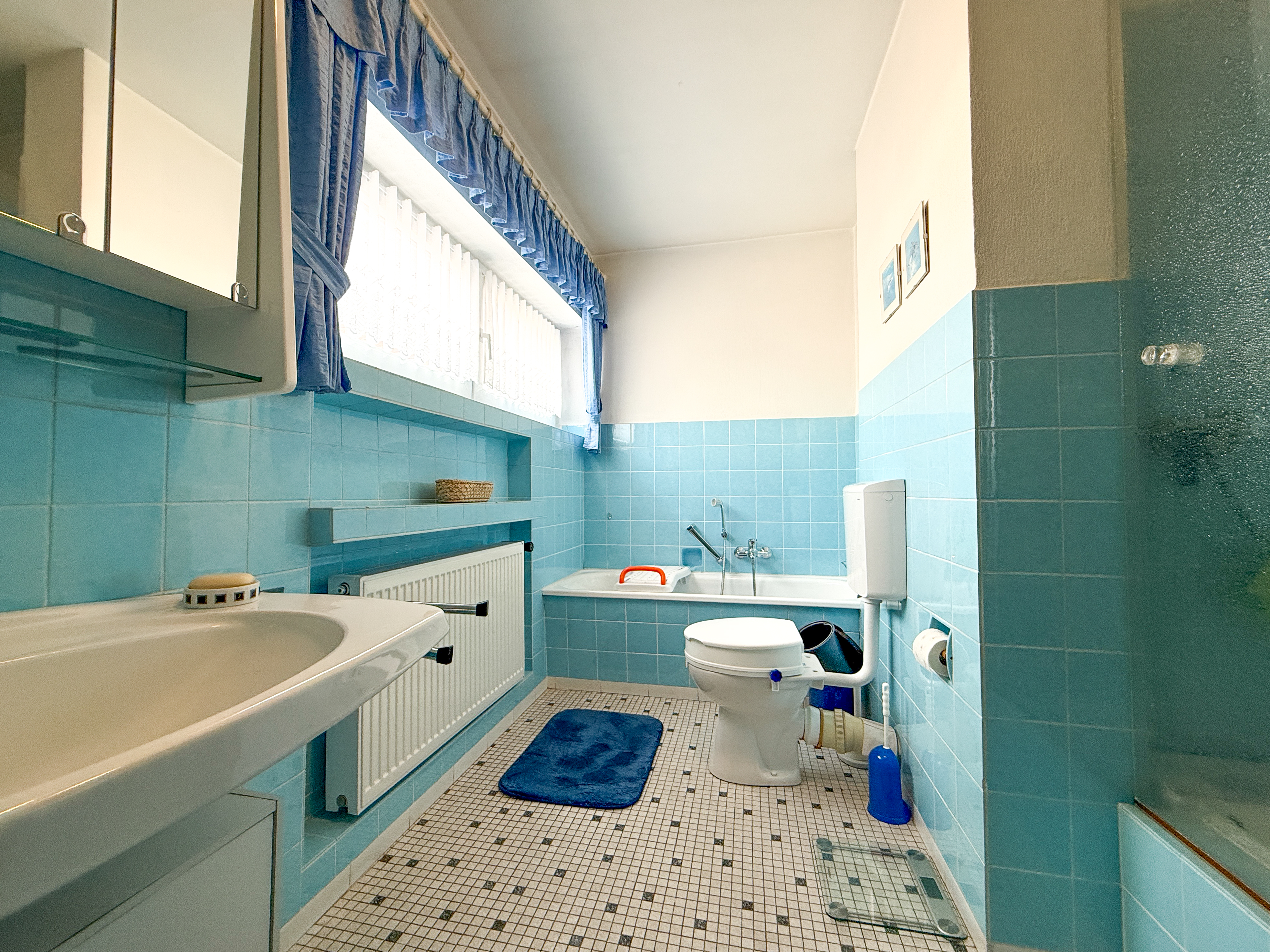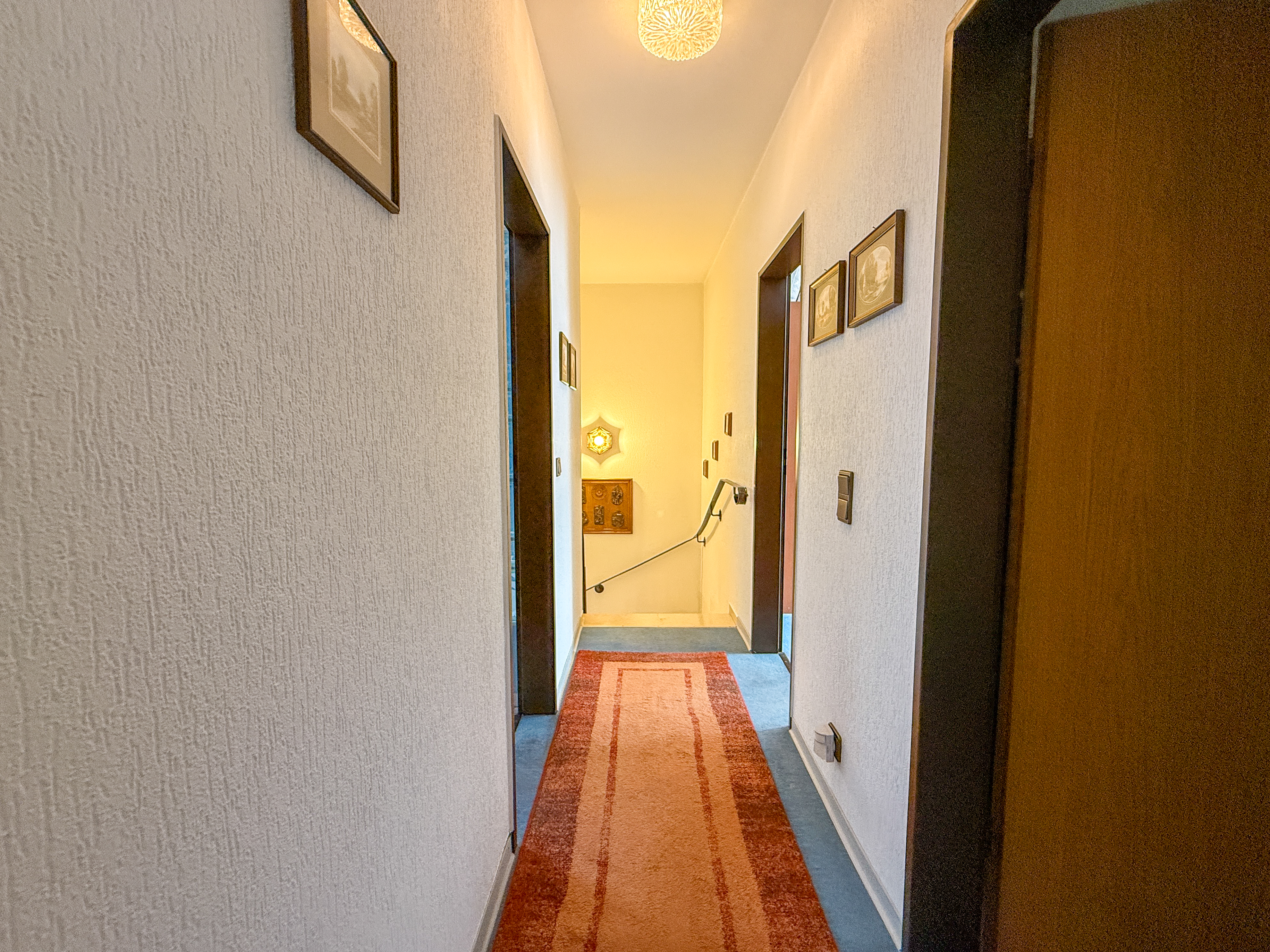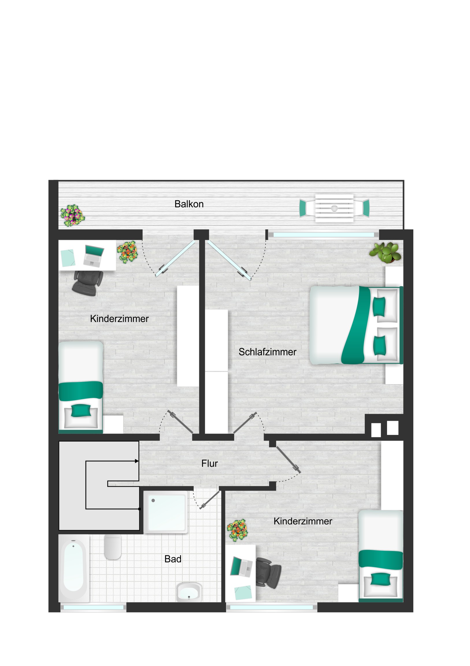 Im Obergeschoss profitieren Sie dank des zweiten Vollgeschosses von einem angenehmen Raumgefühl. Hier befinden sich drei Schlafräume unterschiedlicher Größe – ideal für Eltern, Kinder oder ein Arbeitszimmer. Zwei der Zimmer verfügen über einen Zugang zum Balkon, der zusätzlichen Freiraum schafft. Das Badezimmer bietet Platz für Badewanne und Dusche.