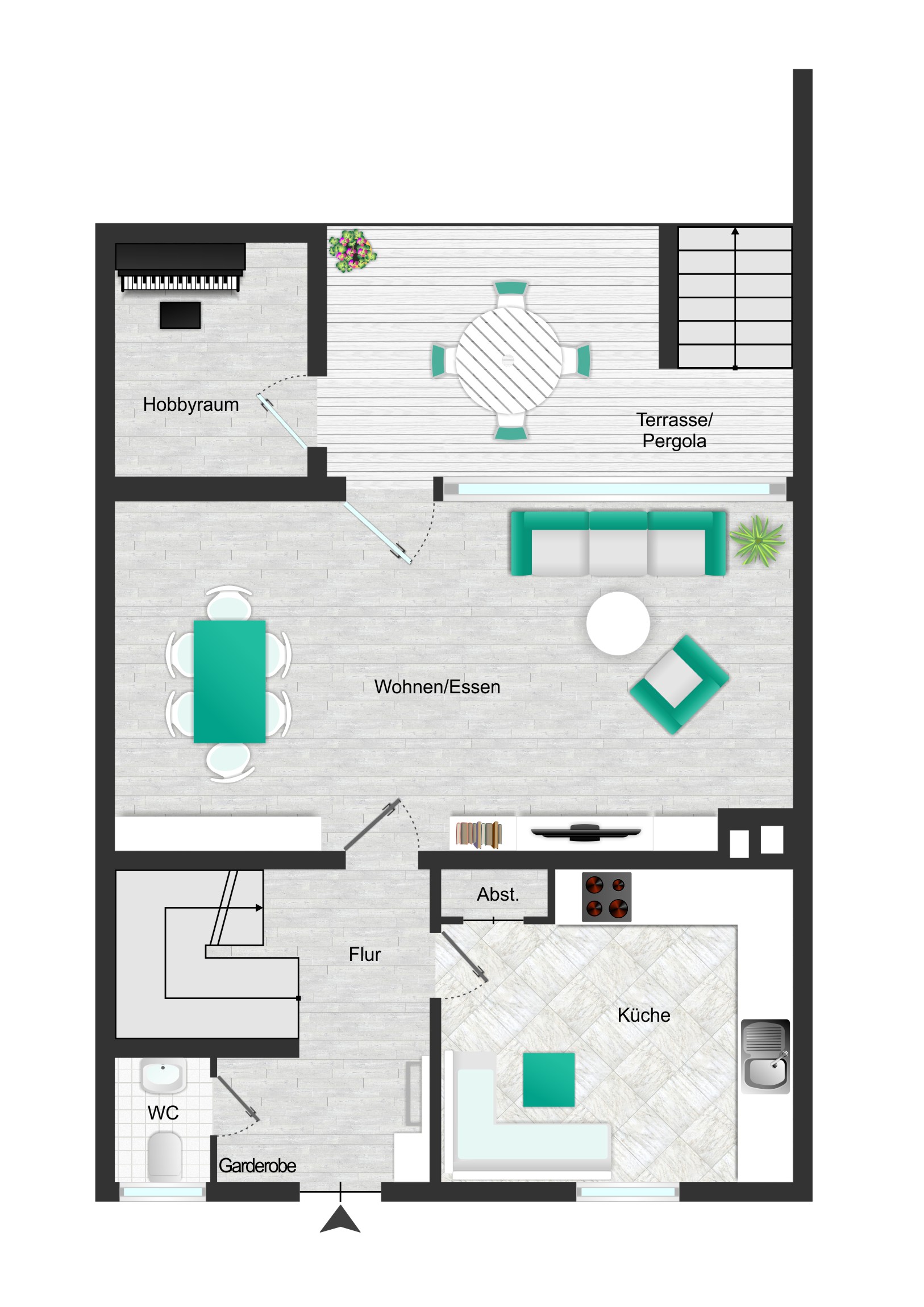 Im Erdgeschoss empfängt Sie eine helle Küche, die ausreichend Platz für eine gemütliche Sitzecke bietet. Ein praktischer kleiner Abstellraum ist direkt integriert. Der Eingangsbereich ist mit einem Garderobenbereich und einem Gäste-WC ausgestattet und sorgt für eine klare, alltagstaugliche Struktur.